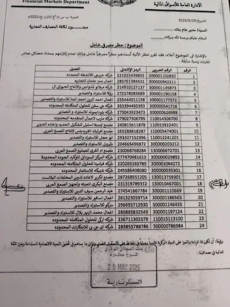 وخلال عام 2024 حظر بنك السودان المركزي نشاط أكثر من 200 شركة تعمل في مجال الصادر ثم 157 شركة لعدم التزام تلك الشركات بسداد حصائل الصادرات طوال فترات سابقة.