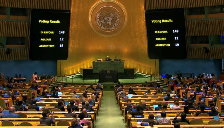 وصوتت لصالح القرار 149 دولة، فيما عارضته 12 دولة وامتنعت 19 دولة عن التصويت.