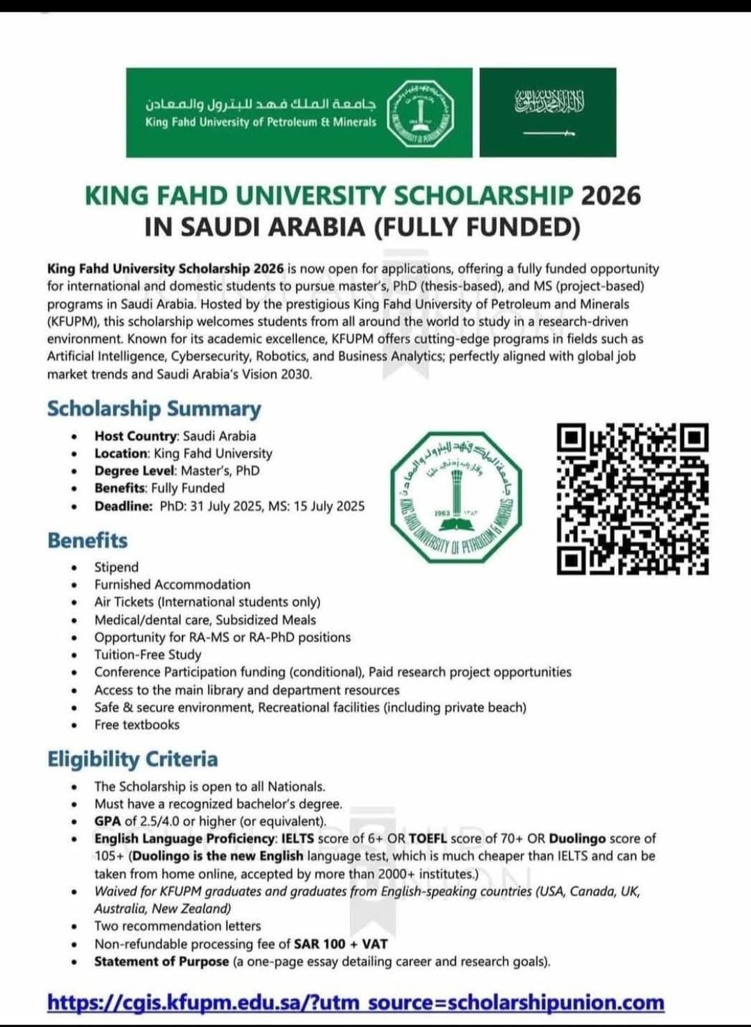 جامعة الملك فهد تعلن عن منح دراسية ممولة بالكامل للعام 2026م
