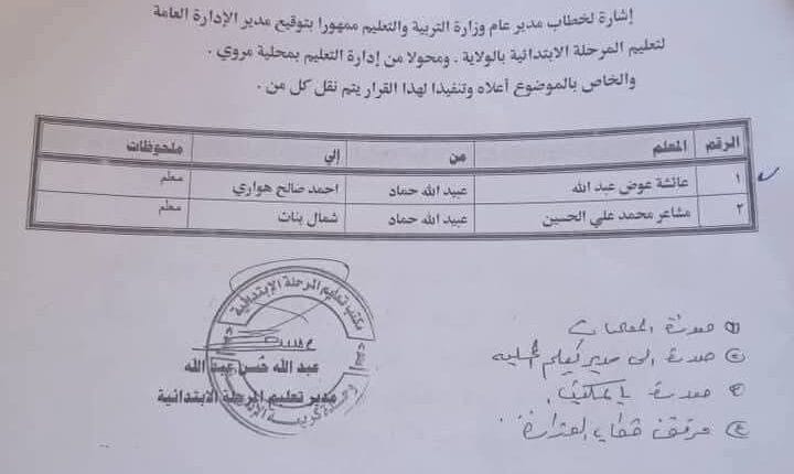 وكانت إدارة التعليم بمحلية مروي أصدرت خطابا بالإشارة لخطاب مدير عام وزارة التربية والتعليم ممهورا بتوقيع مدير الإدارة العامة التعليم المرحلة الابتدائية بالولاية ، ومحولا من إدارة التعليم بمحلية مروي والخاص بالموضوع أعلاه وتنفيذا لهذا القرار يتم نقل كل من “عائشة عوض عبد الله، مشاعر محمد علي الحسين” من مدرسة عبید الله حماد إلى مدارس أحمد صالح هواري، شمال بنات.