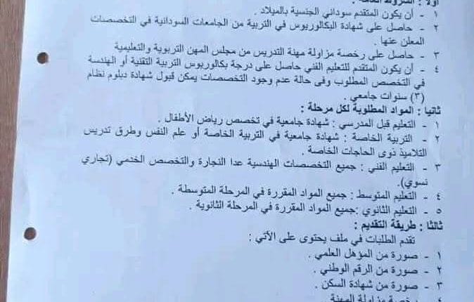 وحددت الوزارة في الإعلان المزيل باسم د. قريب الله محمد أحمد المدير العام لوزارة التربية والتعليم، عدد من الشروط تمثلت في أولاً الشروط العامة: