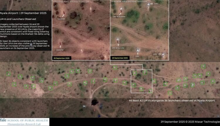 ونشر مختبر ييل حينها صورًا التُقطت في السادس من مايو 2025م وتحققت منها وكالة رويترز، تظهر 13 طائرة مسيّرة من طراز “دلتا وينغ” إلى جانب 16 منصة إطلاق بالقرب من مطار نيالا في إقليم دارفور.