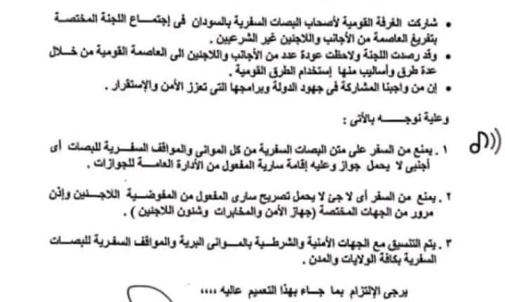 ومنعت الغرفة في القرار من السفر على متن البصات السفرية من كل الموانئ والمواقف السفرية للبصات أي أجنبي لا يحمل جواز وعليه إقامة سارية المفعول من الإدارة العامة للجوازات، ويمنع من السفر أي لأجيء لا يحمل تصريح ساري المفعول من المفوضية اللاجئين وإذن مرور من الجهات المختصة جهاز الأمن والمخابرات وشئون اللاجئين.