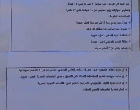 ونوهت إلى أنه في حالة العلاج تقديم أصل التقرير الطبي الرسمي الصادر من وزارة الصحة السودانية، وفي حالة الدراسة تقديم المستندات الدالة علي القبول بإحدى الجامعات المصرية، في حالة وجود القارب مقيمين في مصر يتم تقديم صور الاقامات المصرية السارية.