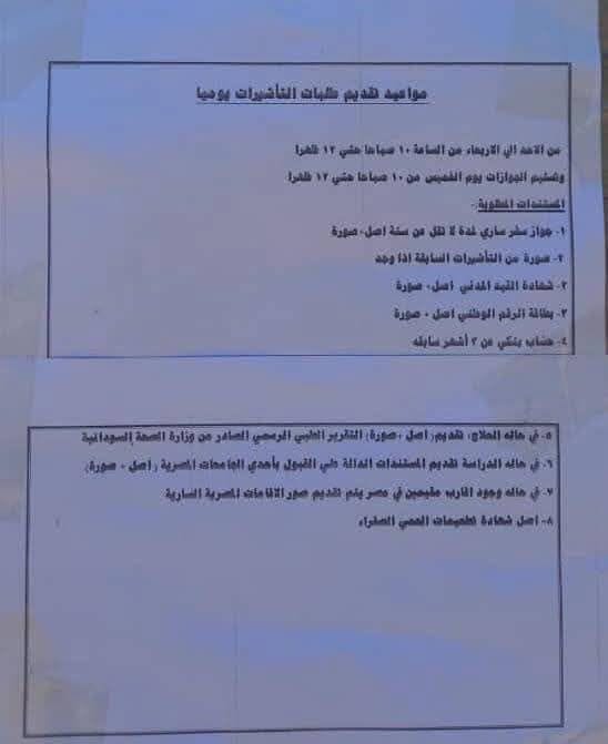 وأشارت وهي منصة غير رسمية تعبر عن المنطقة أي أن القنصلية وضعت شروط أخرى تعتبر معقدة بالنسبة لكثير من المواطنين السودانيين في ظروف الحرب الراهنة من مرضى يحتاجون إلى تلقي العلاج وطلاب منتسبون بالجامعات المصرية فاتت عليهم السنة الدراسية وهم بانتظار التأشيرة.