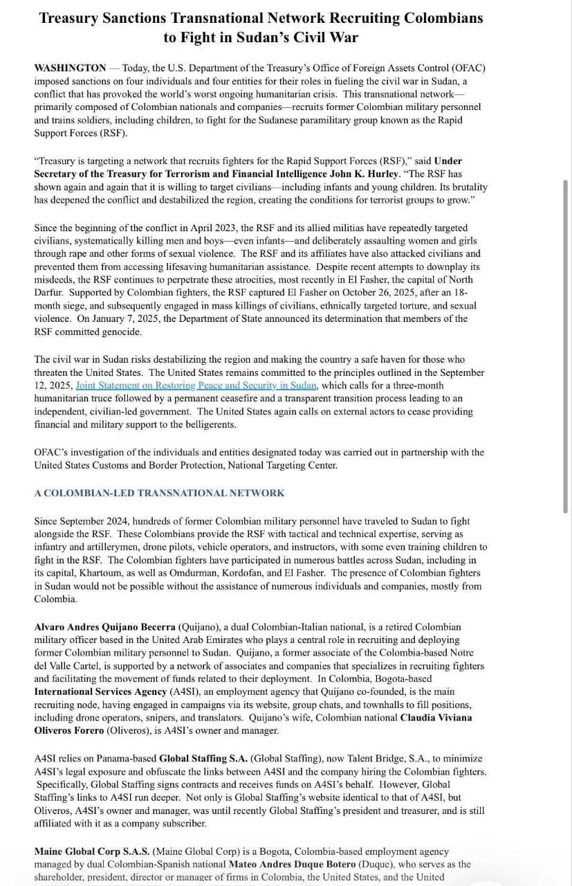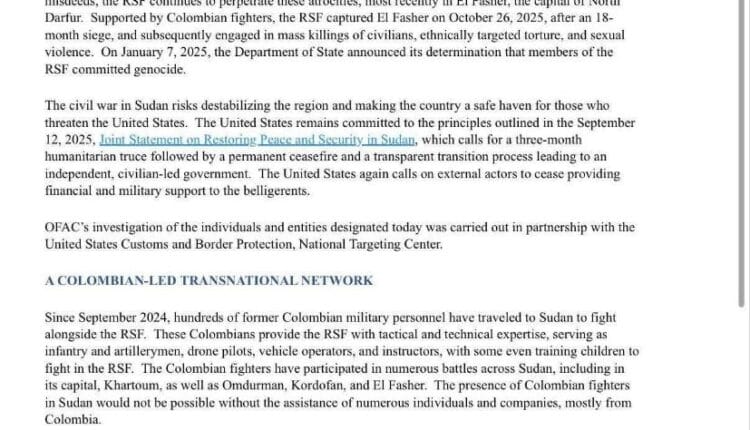 وقالت في بيان إن هذه الشبكة العابرة للحدود الوطنية – المكونة أساسًا من مواطنين وشركات كولومبية تقوم بتجنيد أفراد عسكريين كولومبيين سابقين وتدريب جنود، بمن فيهم أطفال، للقتال في صفوف الجماعة شبه العسكرية السودانية المعروفة باسم قوات الدعم السريع.