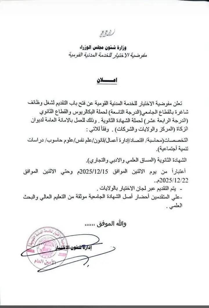 متابعات- الزاوية نت- أعلنت مفوضية الاختيار للخدمة المدنية القومية في السودان، عن فتح باب التقديم لشغل وظائف شاغرة بالقطاع الجامعي (الدرجة التاسعة” لحملة البكالوريوس والقطاع الثانوي “الدرجة الرابعة عشر” لحملة الشهادة الثانوية، وذلك للعمل بالأمانة العامة لديوان الزكاة (المركز والولايات والشركات”.