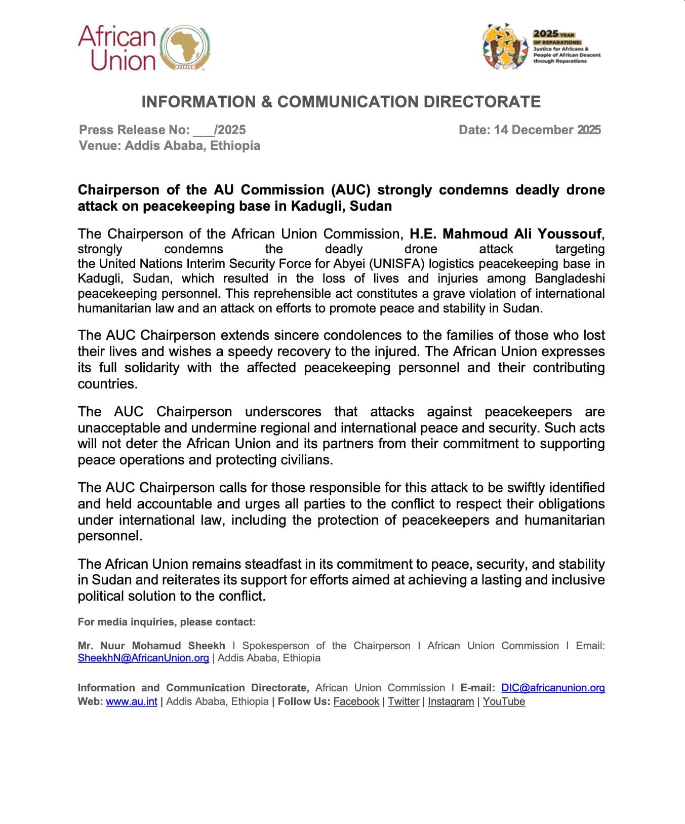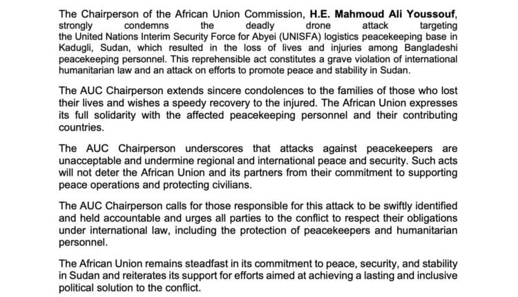 متابعات- الزاوية نت- أدان رئيس مفوضية الاتحاد الأفريقي، محمود علي يوسف، بشدة الهجوم القاتل بالطائرات بدون طيار الذي استهدف قاعدة حفظ السلام اللوجستية لقوة الأمم المتحدة الأمنية المؤقتة لأبيي (يونيسفا) في كادوقلي، السودان، والذي أسفر عن خسائر في الأرواح والإصابات بين أفراد حفظ السلام البنغلاديشيين.