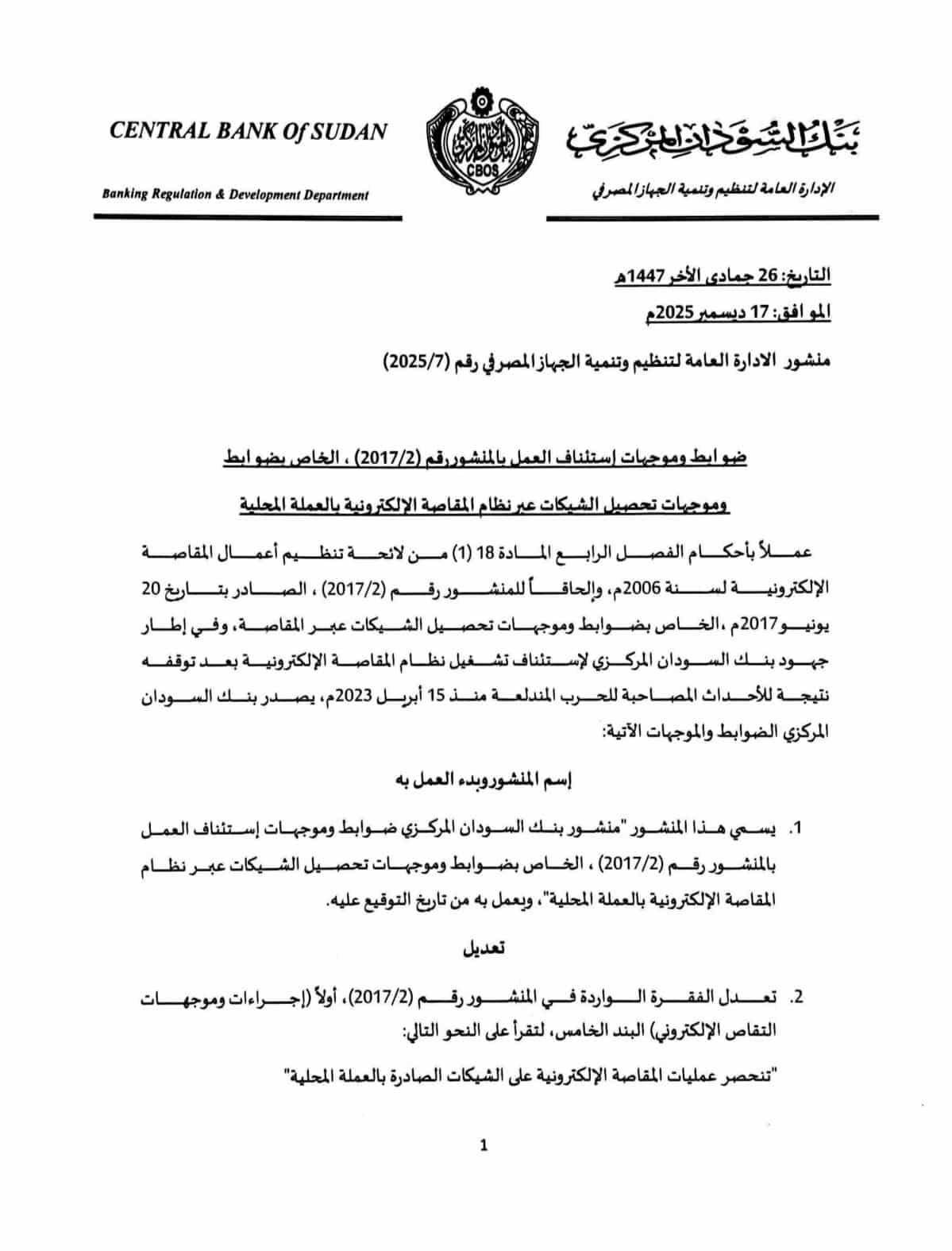 بنك السودان يصدر منشور المقاصة الإلكترونية