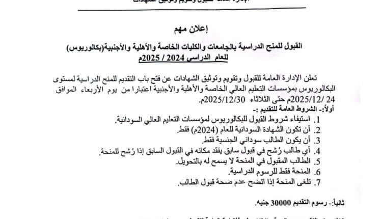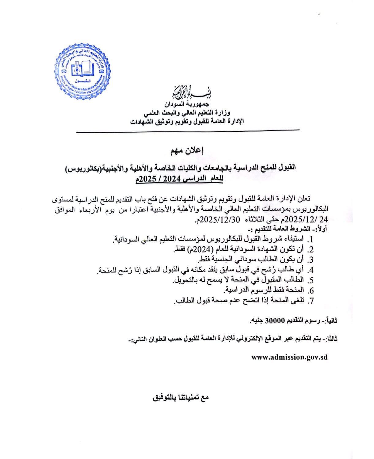 2. أن تكون الشهادة السودانية للعام (2024م) فقط.