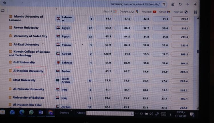 وقالت إن حصول جامعة النيلين على هذه الدرجة تعزيزا لحضورها الأكاديمي والإقليمي وإبراز قدراتها البحثية والتعليمية على المستوى العربي، واعتبارها الجامعة السودانية الوحيدة المصنفة هذا العام، وهو ما يمثل إنجازاً تاريخياً للجامعات السودانية على الساحة الإقليمية بعد غياب جميع الجامعات السودانية عن النسختين الماضيتين من التصنيف.