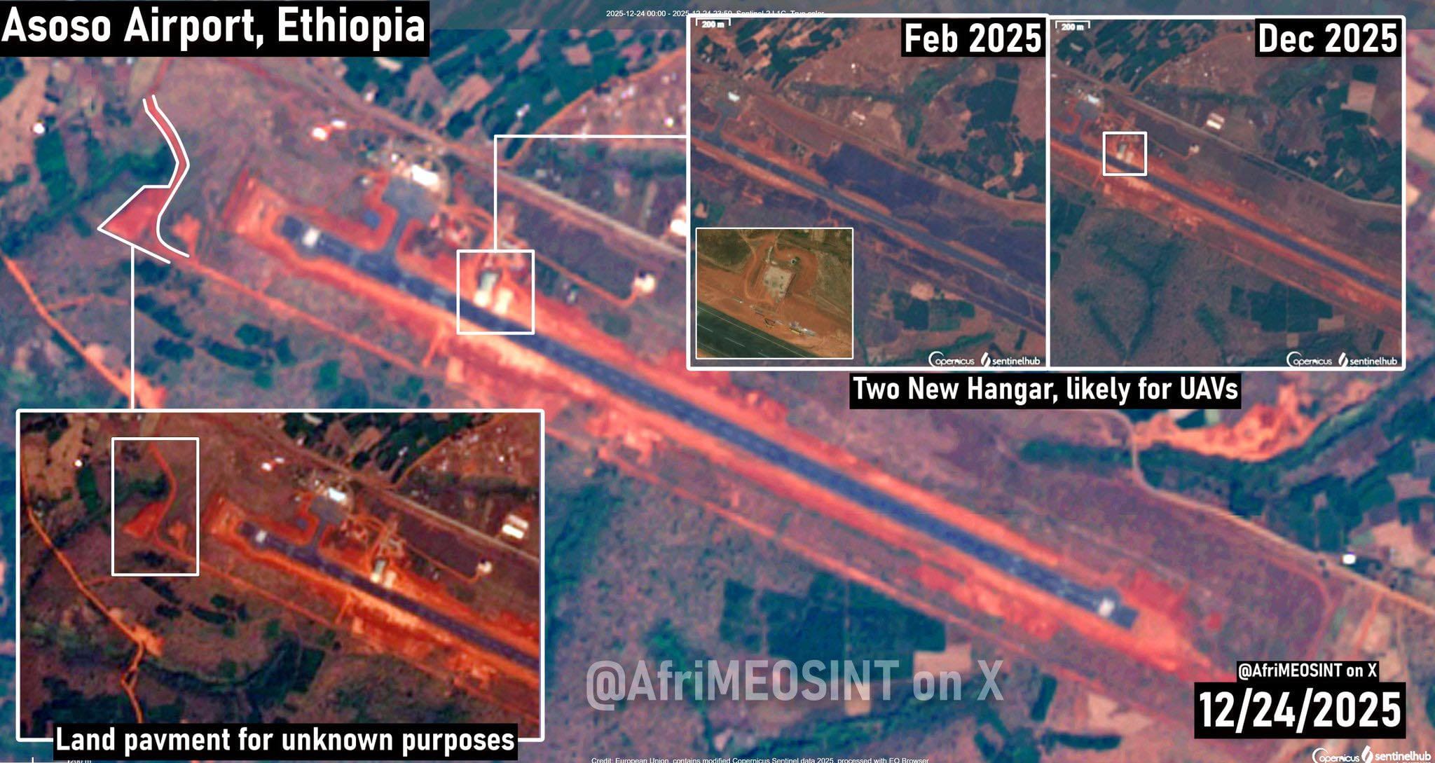 وأكد أن صور الأقمار الصناعية المرفقة من مطار أصوصا لا تكذب حيث تظهر حظيرتان جديدتان يُرجّح تخصيصهما للمسيّرات، أعمال تجهيز أرضي ومهابط، موقع ملاصق للحدود السودانية وفي توقيت ليس بريئًا، تدريب وإمداد مباشر، خطوط لوجستية عبر بربرة ومومباسا، تنسيق استخباري متعدد الأطراف، مرتزقة أجانب وطائرات مسيّرة انطلقت فعلًا لاستطلاع النيل الأزرق.
