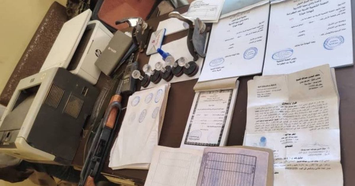 وقالت إن عملية القبض جاءت نتيجة لجهود ومتابعة دقيقة من فرعية المباحث الجنائية لشرق النيل واسفرت عن ضبط مستندات وأختام التزوير ودفاتر شهادات حيازة فارغة ومختومة للقرى المذكورة مع ضبط خمسة أختام رسمية للوحدة الإدارية لوادي سوبا وكذلك دفاتر إيصالات مالية و جهازا طابعة ليزر وجهاز اسكنر وقطعة سلاح كلاشنكوف وبندقية “جيم 3” استخدمت في تهديد ونهب الضحايا.