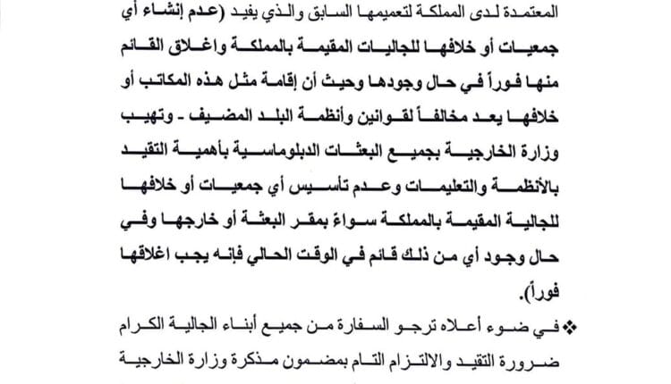 وأكدت السفارة في تعميم أن وزارة الخارجية تهيب بجميع البعثات الدبلوماسية بأهمية التقيد بالأنظمة والتعليمات وعدم تأسيس أي جمعيات أو خلافها للجالية المقيمة بالمملكة سواء بمقر البعثة أو خارجها وفي حال وجود أي من ذلك قائم في الوقت الحالي فإنه يجب اغلاقها فوراً.
