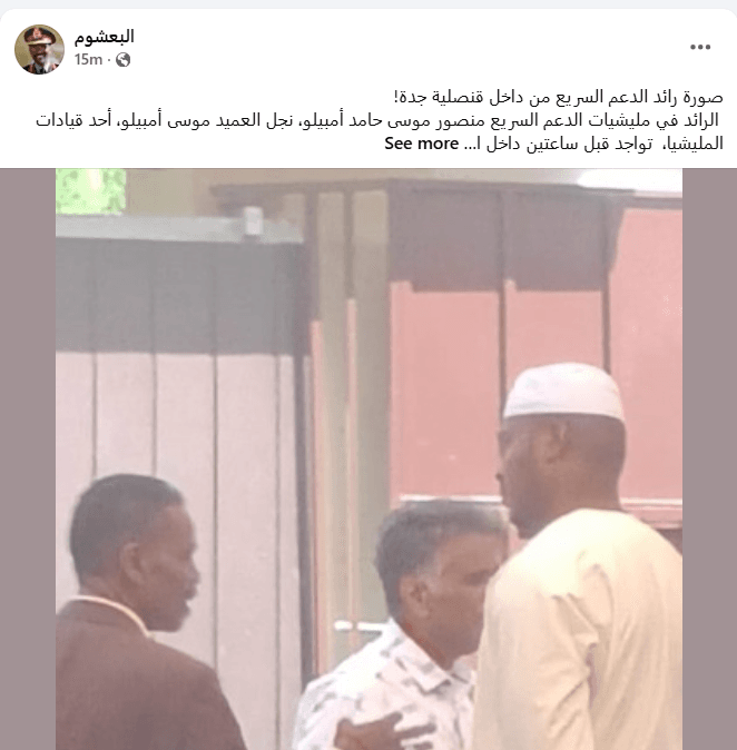 متابعات- الزاوية نت- نشرت صفحة بالعشوم صورة لرائد بالدعم السريع منصور موسى حامد أمبيلو، نجل العميد موسى أمبيلو، أحد قيادات المليشيا، قبل ساعتين اليوم 6 يناير داخل القنصلية السودانية في جدة لتجديد جواز سفره، تمهيداً لمغادرة المملكة عبر المطار إلى تشاد، ثم الدخول إلى السودان.