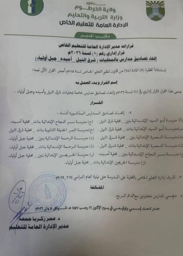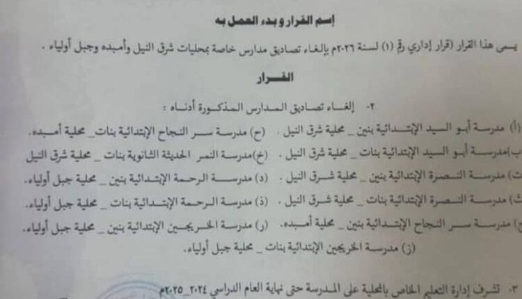 وكانت السلطات في الخرطوم أصدرت قرارا قضى بإلغاء تصاديق مدارس خاصة بمحليات شرق النيل وأمبده وجبل أولياء، شملت كل من مدرسة سر النجاح الابتدائية بنات محلية أميده، مدرسة أبو السيد الابتدائية بنين – محلية شرق النيل، مدرسة أبو السيد الابتدائية بنات، محلية شرق النيل، مدرسة النصرة الابتدائية بنين محلية شرق النيل، مدرسة النصرة الابتدائية بنات محلية شرق النيل مدرسة سر النجاح الابتدائية بنين – محلية أمبده