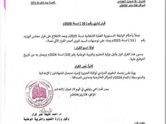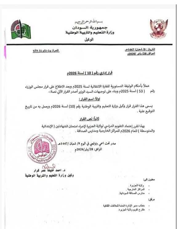 وقالت مدرسة الصداقة بالقاهرة في تنويه إلى أسر الطلاب السودانيين بمصر إنه بموجب قرار وكيل وزارة التعليم والتربية الوطنية رقم (6) لسنة 2026 ، والذي قرر فيه عمل المدارس السودانية بالخارج بتقويم ولاية الجزيرة ، وبالتالي تحديد موعد امتحانات الشهادة الابتدائية والمتوسطة للعام الدراسي 2026 في “امتحان الشهادة الابتدائية يوم الأحد 2026/4/26، وامتحان الشهادة المتوسطة يوم : الأحد 2026/5/24.