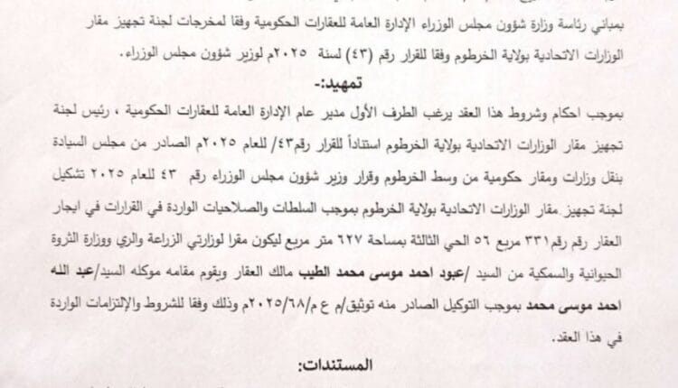 وقال إنّه تم تأجير أربع وزارات فقط من إجمالي 22 وزارة، (تم توقيع عقد الإيجار لوزارتين، والعقدان الآخران تحت الإجراء)، وتتم ذلك من خلال وزارة المالية وبالجنيه السوداني فقط، وتشمل هذه الوزارات: “الزراعة والري في أركويت مربع 53، الثروة الحيوانية في أركويت مربع 53، الخارجية والتعاون الدولي في الرياض مربع 21، والنقل والبنية التحتية في أم درمان كرري / شارع الوادي خلف أبو الفاضل).