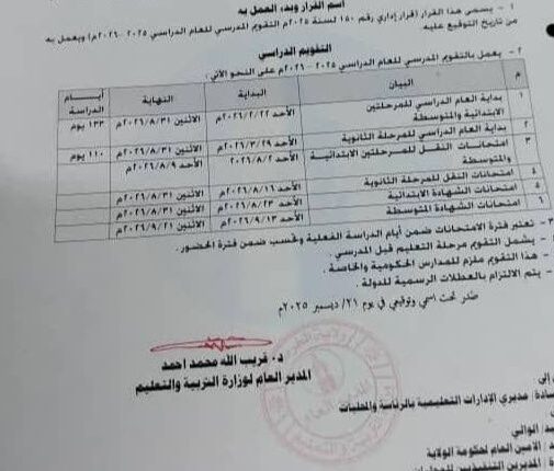 متابعات- الزاوية نت- أصدر مدير عام وزارة التربية والتعليم بولاية الخرطوم، د. قريب الله محمد أحمد، القرار الإداري رقم (150) لسنة 2025م، والخاص بتنظيم التقويم المدرسي للعام الدراسي 2025-2026م.