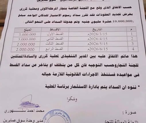 واقر الإعلان الصادر من محمد احمد سنهوري مدير وحدة سوق صابرين، جدولة السداد على النحو التالي: القسط الأول من تاريخ الخامس عشر من مارس الجاري، بمبلغ 3 ملايين جنيه، والقسط الثاني من تاريخ الخامس عشر من أبريل المقبل بمبلغ 3 ملايين جنيه، والقسط الثالث من تاريخ الخامس عشر من مايو بمبلغ مليوني جنيه والقسط الرابع من تاريخ الخامس عشر من يونيو المقبل بمبلغ مليوني جنيه.