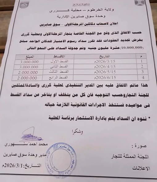 متابعات- الزاوية نت- أصدرت محلية كرري وحدة سوق صابرين الإدارية بولاية الخرطوم، إعلانا إلى أصحاب الدكاكين المرحلة الأولى حددت بموجبه رسوم الامتياز للدكان الواحد بمبلغ (10.000.000) عشرة ملايين جنيه، وذلك حسب الاتفاق الذي وقع مع اللجنة الخاصة بتجار المرحلة الأولى ومحلية كررى بغرض تجديد العقودات.