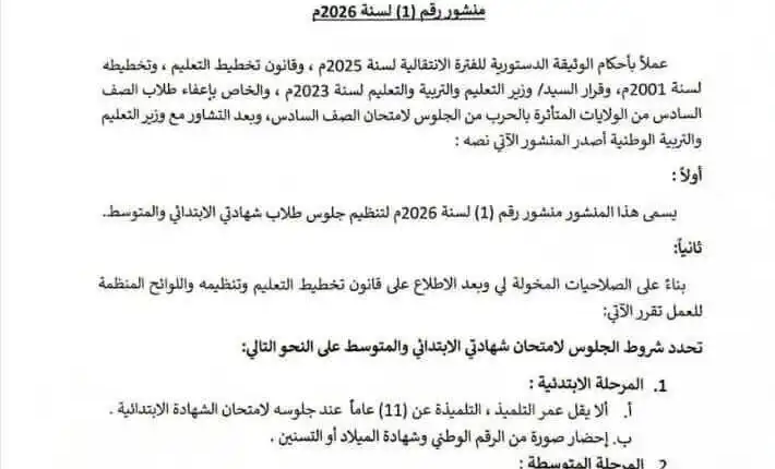 وأشار المنشور إلى أنه بناءً على الصلاحيات المخولة وبعد الاطلاع على قانون تخطيط التعليم وتنظيمه واللوائح المنظمة للعمل تقرر، تحديد شروط الجلوس لامتحان شهادتي الابتدائي والمتوسط على النحو التالي “المرحلة الابتدائية، الا يقل عمر التلميذ، التلميذة عن (11) عاماً عند جلوسه لامتحان الشهادة الابتدائية، احضار صورة من الرقم الوطني وشهادة الميلاد أو التسنين