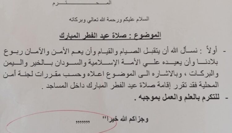 وقررت في منشور وفقا لتوجيهات لجنة أمن المحلية إقامة صلاة عيد الفطر المبارك داخل المساجد.