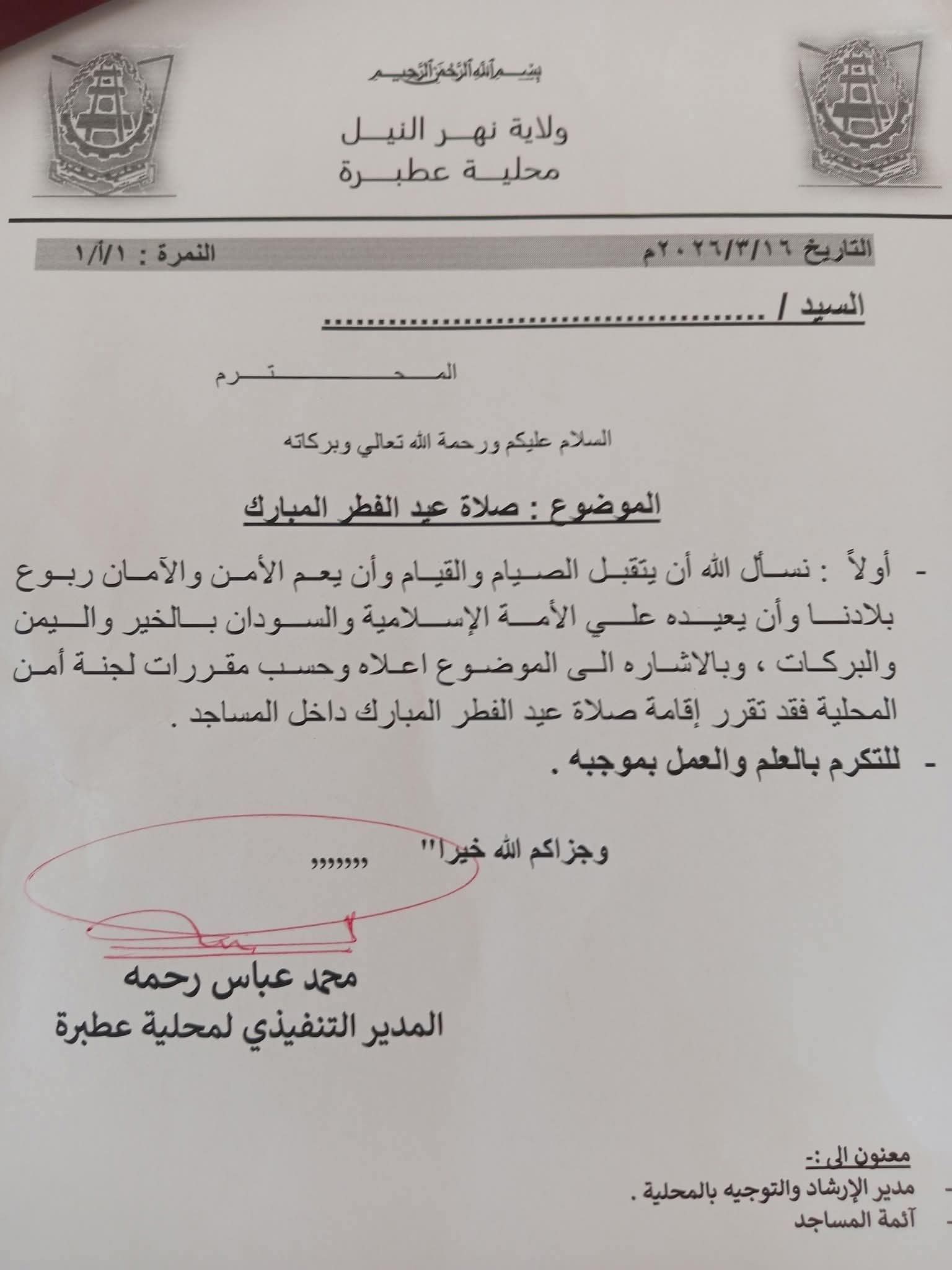 متابعات ـ الزاوية نت ـ أصدرت محلية عطبرة بولاية نهر النيل شمالي السودان؛ قرارا قضى بمنع صلاة عيد الفطر المبارك في الساحات العامة في المدينة.