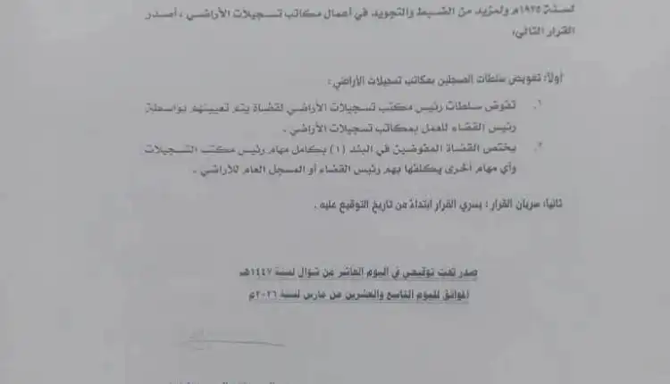 ويختص القضاة المفوضين في البند (1) بكامل مهام رئيس مكتب التسجيلات واى مهام أخرى يكلفها بهم رئيس القضاء أو المسجل العام للأراضي، ويسري القرار ابتداء من تاريخ التوقيع عليه