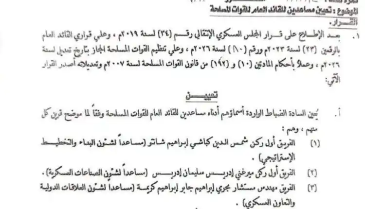 وجاء القرار بعد الاطلاع على قرار المجلس العسكري الانتقالي رقم (34) لسنة 2019م ، وعلي قراري القائد العام بالرقمين (23) لسنة 2023م ورقم ( 10) لسنة 2026 ، وعلي تنظيم القوات المسلحة المجاز بتاريخ تعديل لسنة 2026م ، وعملاً بأحكام المادتين (10) و (192) من قانون القوات المسلحة لسنة 2007م