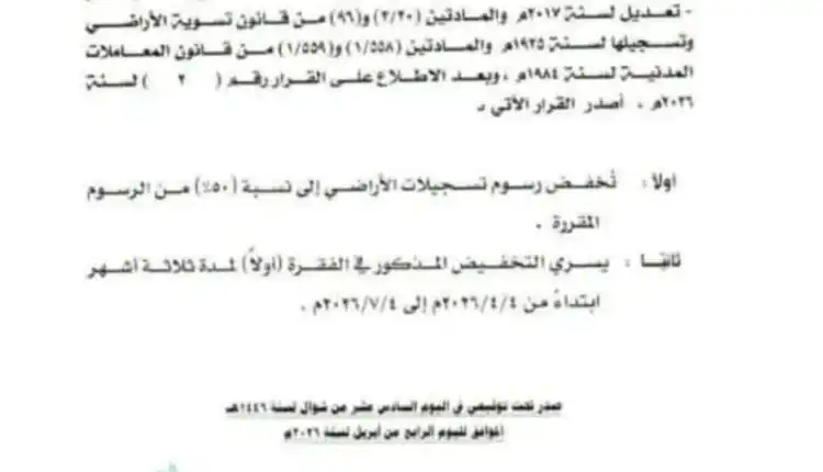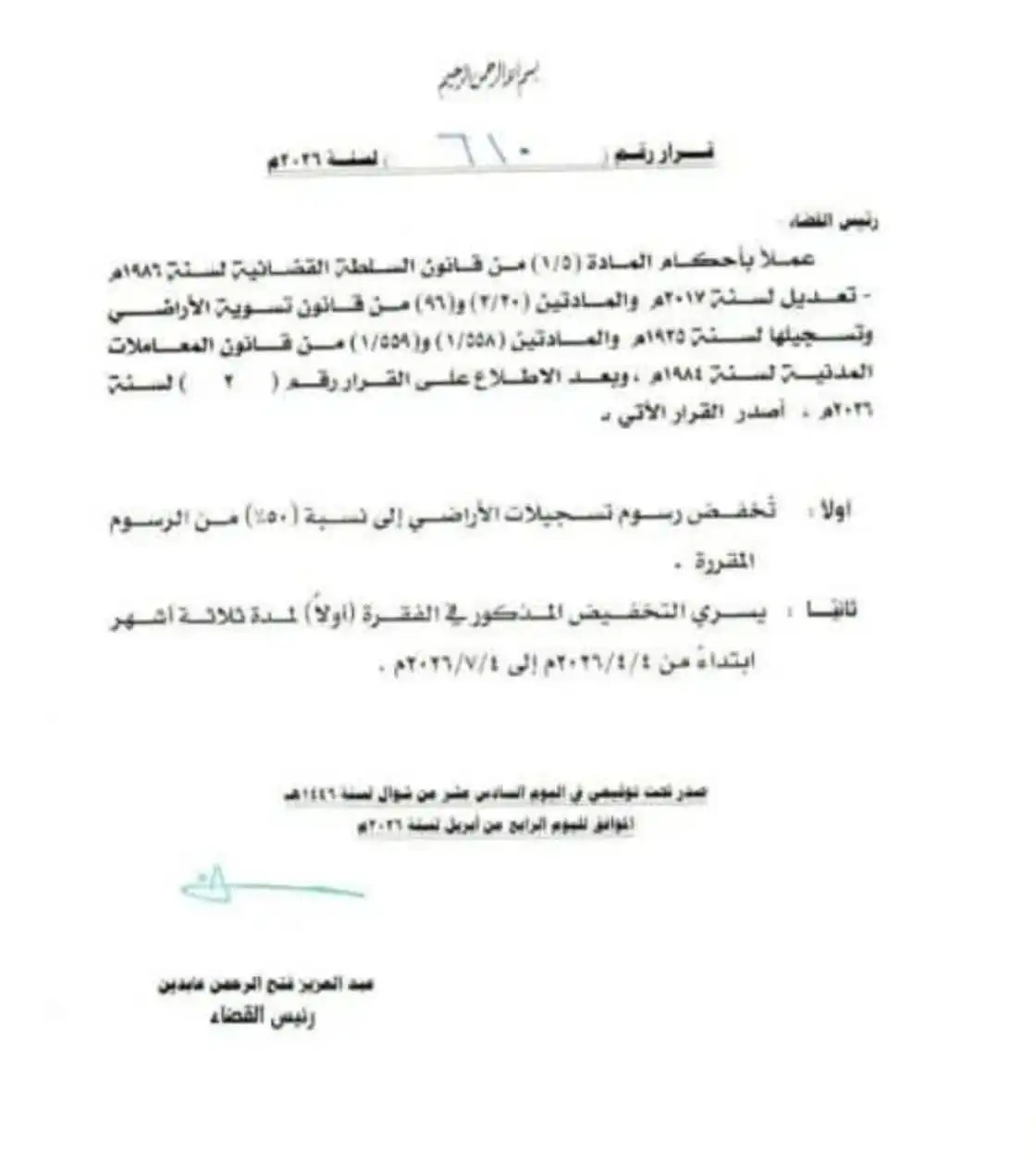 متابعات- الزاوية نت- أصدر رئيس القضاء عبد العزيز فتح الرحمن عابدين، قرارا قضى تخفض رسوم تسجيلات الأراضي إلى نسبة (50%) من الرسوم المقررة ويسري التخفيض المذكور في الفقرة (أولاً) لمدة ثلاثة أشهر ابتداء من 2026/4/4م إلى 2026/7/4م.