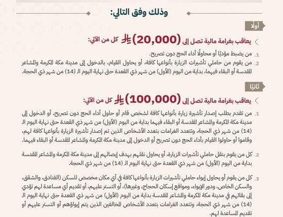 وجاءت العقوبات تحت عبارة “لا حج لا تصريح” بفرض غرامة مالية تصل إلى (20,000) لكل من يضبط مؤديا أو محاولا أداء الحج دون تصريح، من يقوم من حاملي تأشيرات الزيارة بأنواعها كافة، أو يحاول القيام بالدخول إلى مدينة مكة المكرمة والشاعر لمقدسة أو البقاء فيهما، بداية من اليوم (الأول) من شهر ذي القعدة حتى نهاية اليوم الـ (14) من شهر ذي الحجة.