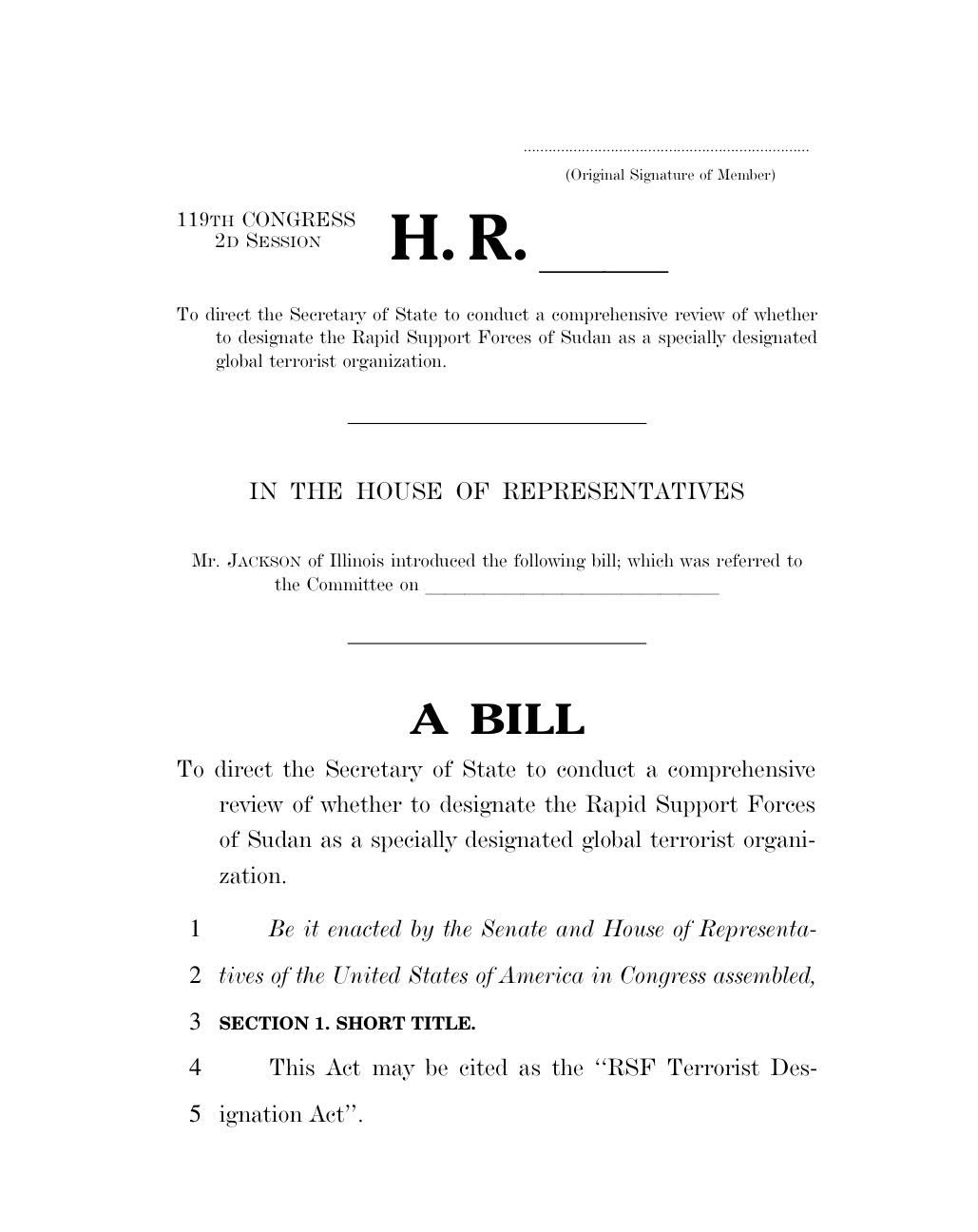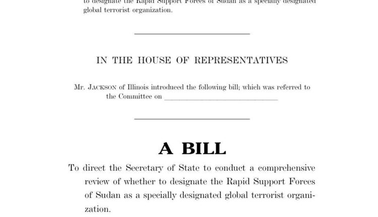 ووجه النواب المشاريع إلى وزير الخارجية لإجراء مراجعة شاملة لتحديد ما إذا كان سيتم تصنيف قوات الدعم السريع السودانية كمنظمة إرهابية عالمية مصنفة بشكل خاص، ويُقر بموجب هذا من قبل مجلس الشيوخ ومجلس النواب وأعضاء الولايات المتحدة الأمريكية المجتمعين في الكونغرس.