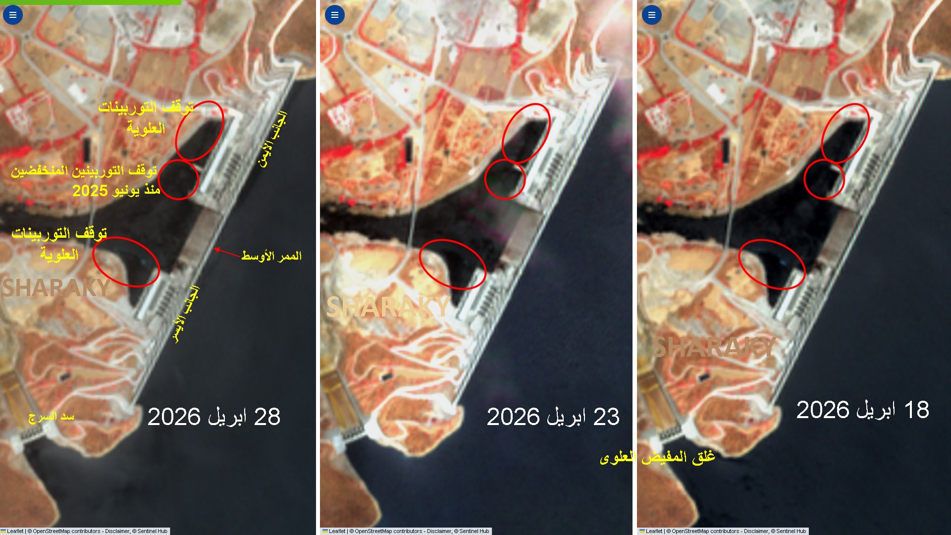 متابعات- الزاوية نت- أظهرت صور الأقمار الصناعية عن توقف توربينات سد النهضة العلوية خلال الأسبوعين الآخرين بعد تشغيل محدود من قبل، واستمرار توقف التوربينين المنخفضين منذ يونيو الماضي، وبذلك تظهر بحيرة السد بنفس الحجم دون تغيير يذكر منذ 10 ابريل الجاري، بنحو 47 مليارم3 عند منسوب 629 م فوق سطح البحر، وانخفاض 11 م عن أعلى منسوب 640 م عند افتتاح السد فى 9 سبتمبر الماضي.