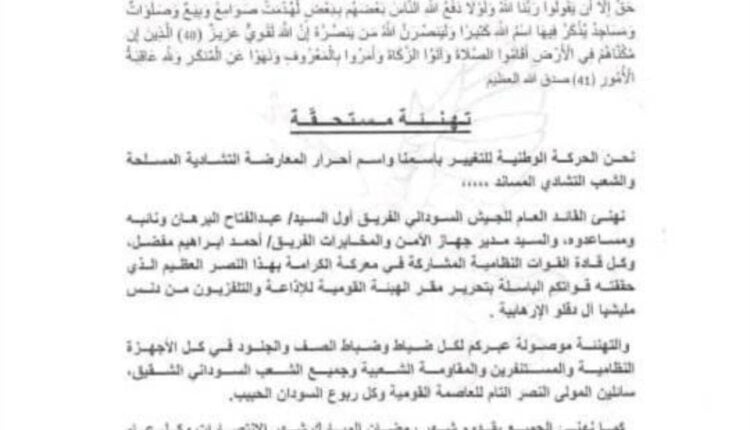 هنأ رئيس الحركة الوطنية للتغيير في تشاد “عاطف السماني”، الفريق أول ركن عبدالفتاح البرهان قائد الجيش السوداني، بتحرير مبنى الإذاعة القومية السودانية، في سابقة جديدة من فصول الأزمة السودانية.