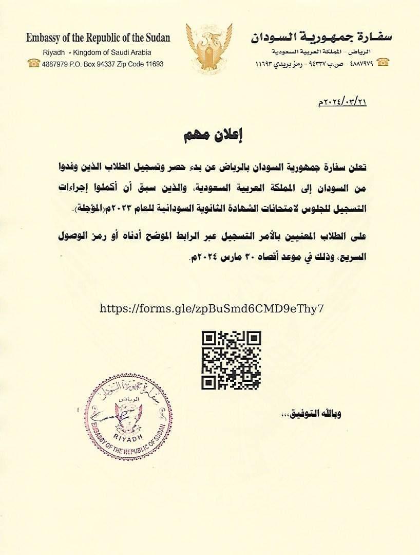 أعلنت سفارة جمهورية السودان بالرياض عن بدء حصر وتسجيل الطلاب الذين وفدوا من السودان إلى المملكة العربية السعودية، والذين سبق أن أكملوا إجراءات التسجيل للجلوس لامتحانات الشهادة الثانوية السودانية للعام ٢٠٢٣م (المؤجلة).
