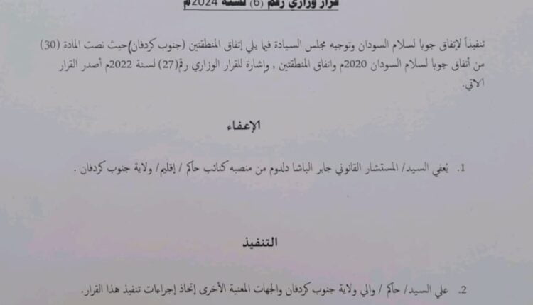 أصدر وزير الحكم الاتحادي محمد كارتيلا صالح، أمس، قرارا قضى بإعفاء نائب والي جنوب كردفان، المستشار القانوني جابر الباشا دلدوم، من منصبه.