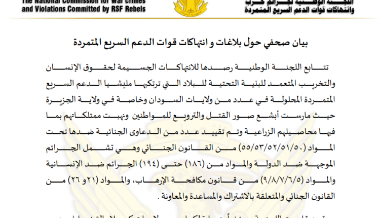 متابعات- الزاوية نت- أعلنت اللجنة الوطنية للانتهاكات الجسيمة لحقوق الانسان والتخريب المتعمد للبنية التحتية من قبل مليشيا الدعم السريع المتمردة المحلولة في بيان لها عن فتح بلاغات وتقييد عدد من الدعاوى الجنائية في مواجهة المليشيا والمتعاونين معها بولايات الجزيرة والقضارف وكسلا ونهر النيل والشمالية.