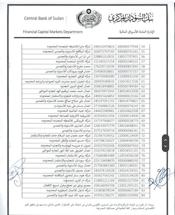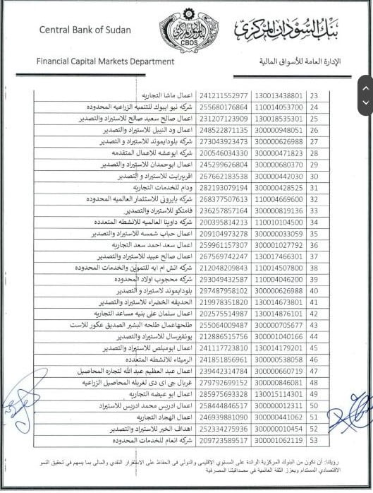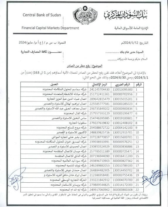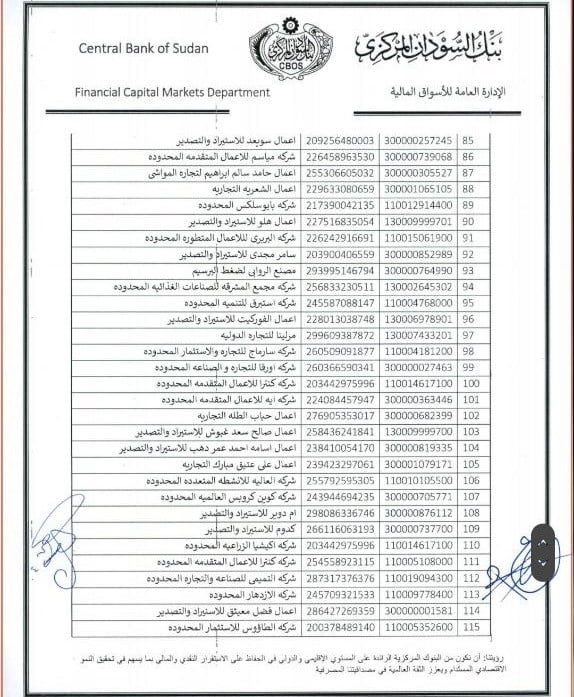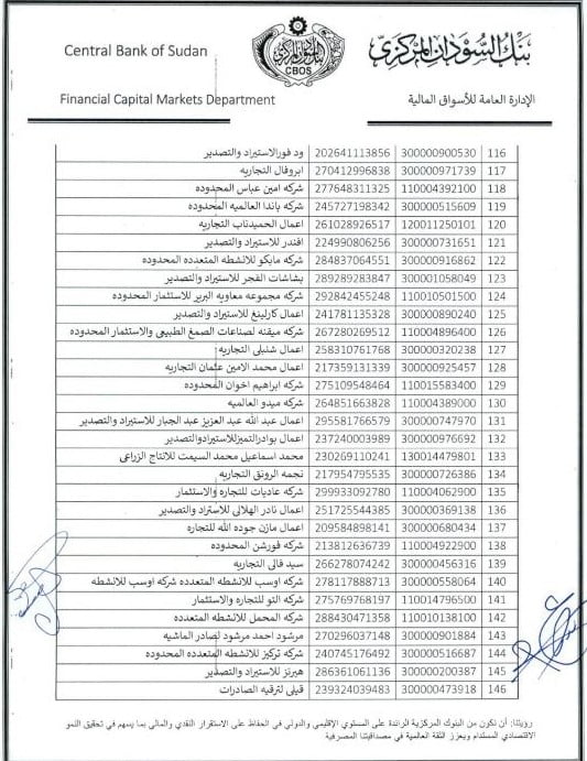 بالأسماء.. بنك السودان يرفع الحظر عن 163 شركة صادر