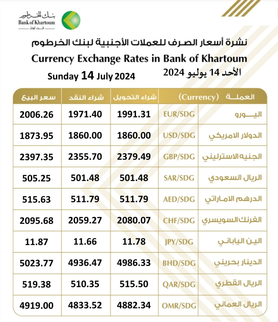 متابعات- الزاوية نت- أعلن بنك الخرطوم، زيادات جديدة على أسعار الدولار الأميركي والعملات الأخرى، مقابل الجنيه السوداني في تداولات اليوم 14 يوليو 2024م، حيث أعلن 1860 جنيه سعرا لشراء الدولار مقابل 1873.95 جنيه للبيع، بينما كانت أسعار الأمس 1850 جنيه للشراء مقابل 1863.88 جنيه للبيع.