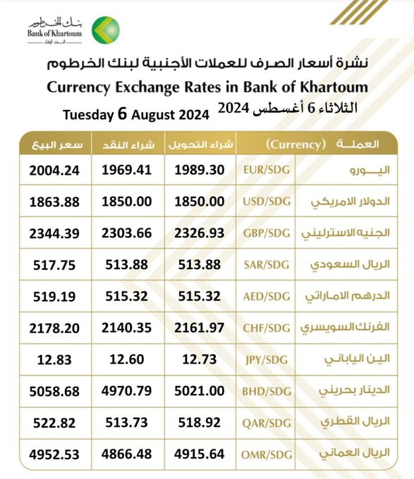 متابعة- الزاوية نت- خفض بنك الخرطوم، في نشرة اليوم 6 أغسطس، أسعار الدولار والعملات مقابل الجنيه السوداني، بنقصان طفيف عن تداولات الأمس 5 أغسطس، حيث أعلن شراء الدولار بمبلغ 1850 جنيه مقابل 1863 جنيه للشراء، بينما كانت أسعار الأمس 1870 جنيه للشراء مقابل 1884 جنيه للبيع.