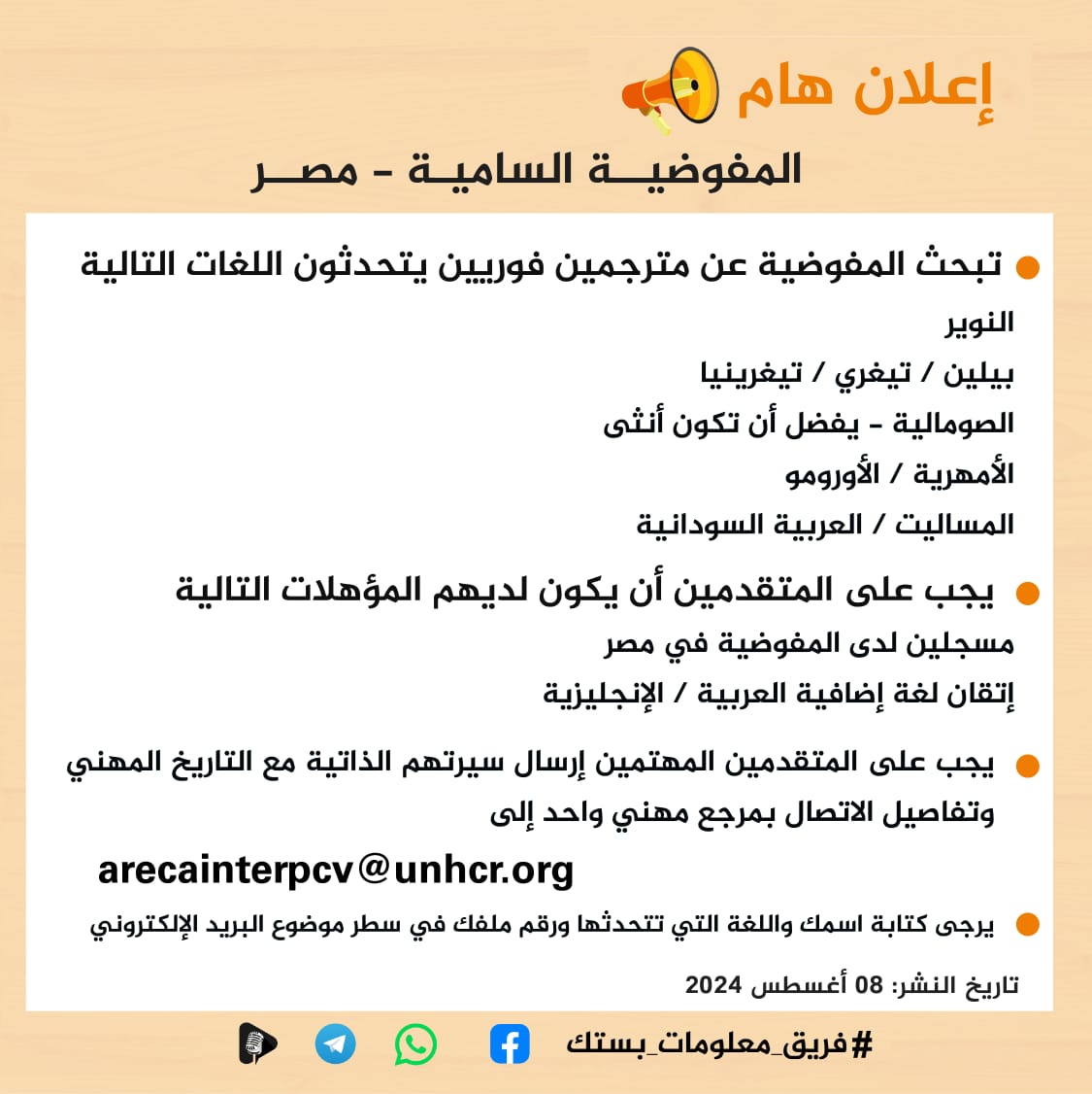 وأشارت إلى انه يجب على المتقدمين أن يكون لديهم المؤهلات التالية: مسجلين لدى المفوضية في مصر؛ إتقان لغة إضافية العربية، الإنجليزية”