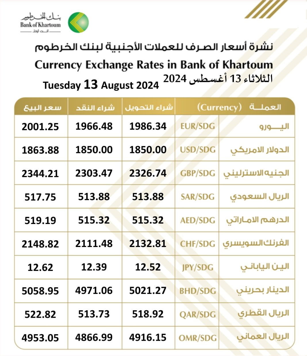 متابعة- الزاوية نت- أعلن بنك الخرطوم، نشرة أسعار الدولار والأميركي والعملات الأخرى مقابل الجنيه السوداني، حسب تداولات اليوم 13 أغسطس، 2024م، في ظل استقرار تشهده أسعار العملات في السوق الموازي والبنوك السودانية، حيث لم تشهد منذ أسبوع أي تغيرات تذكر.
