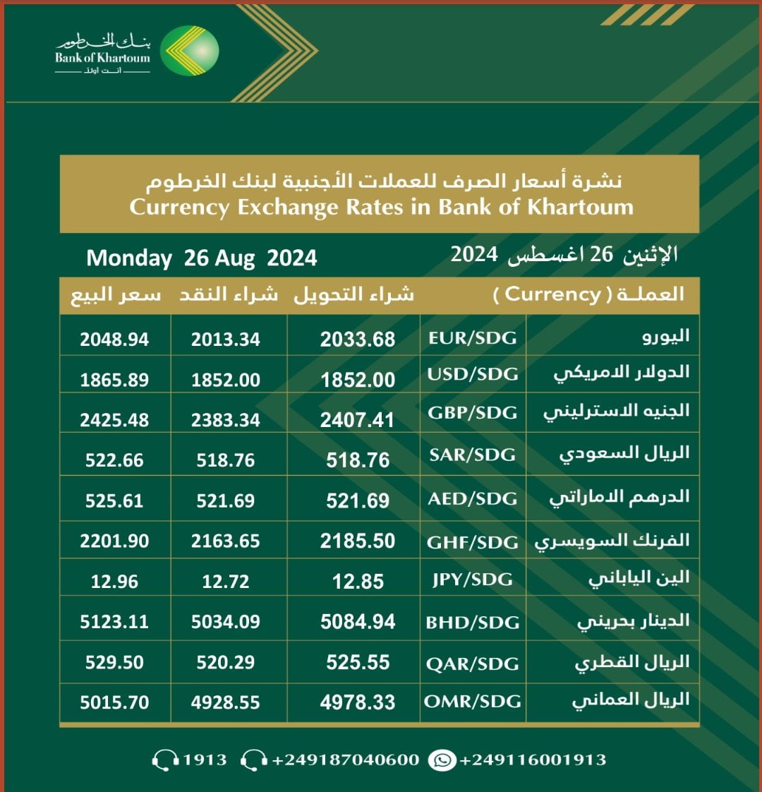 إلى ذلك رفع بنك الخرطوم في نشرة اليوم 26 أغسطس، سعر الدولار مقابل الجنيه حيث بلغ 1852 جنيه للشراء مقابل 1865 جنيه للبيع.