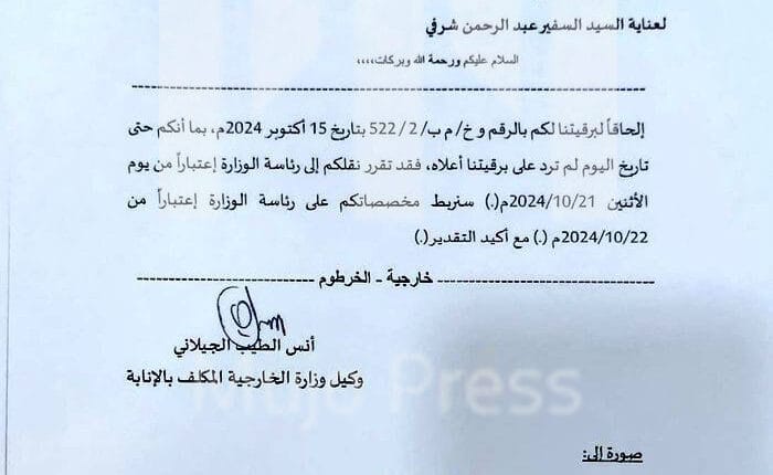 وأرسلت وزارة الخارجية، خطابا إلى السفير بتاريخ 15 أكتوبر 2024م، ممهورا باسم أنس الطيب الجيلاني وكيل وزارة الخارجية المكلف بالإنابة، قال فيه: أرجو إفادتكم بأن عدم وصولكم في التاريخ المحدد من قبلكم ستترتب عليه إجراءات إدارية بحق السفير رئيس البعثة مع أكيد التقدير”.