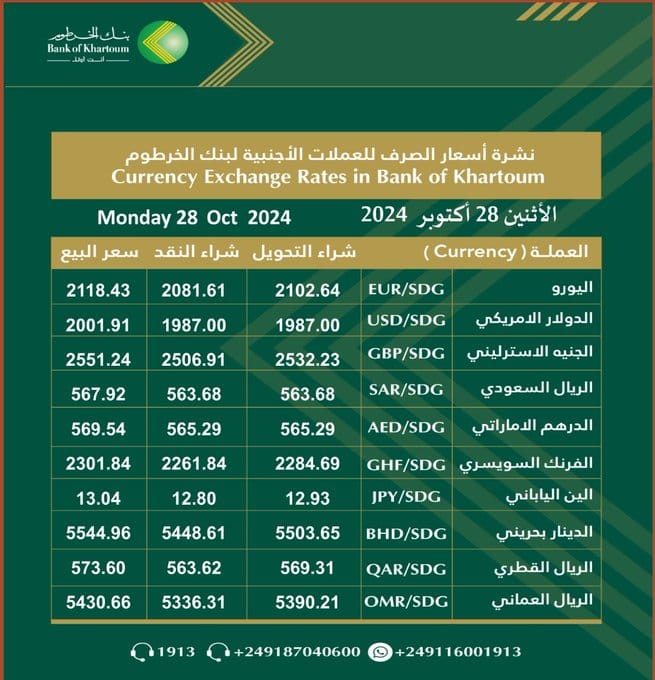 اقتصادالرئيسية أسعار الدولار والعملات الأخرى من بنوك “الخرطوم وفيصل الإسلامي و أم درمان الوطني” بواسطة الزاوية في أكتوبر 28, 2024 0 شارك متابعات- الزاوية نت- نشرت بنوك سودانية أسعار العملات والدولار مقابل الجنيه السوداني اليوم 28 أكتوبر 2024م، شملت “بنك الخرطوم وبنك فيصل الإسلامي السوداني وبنك أم درمان الوطني”. تابع النشرات أدناه لمعرفة الأسعار الدولار 0 شارك