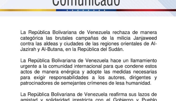 متابعات- الزاوية نت- أعلنت جمهورية فنزويلا البوليفارية، رفضها القاطع للحملات الوحشية التي تقوم بها ميليشيا الجنجويد ضد قرى ومدن المنطقتين الشرقيتين الجزيرة والبطانة في جمهورية السودان.