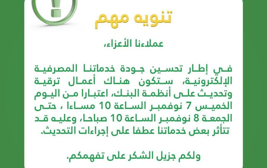 متابعات- الزاوية نت- أصدر بنك الخرطوم تنويها عاجلًا إلى عملائه، عن انه في إطار تحسين جودة خدماته المصرفية الإلكترونية، ستكون هناك أعمال ترقية وتحديث على أنظمة البنك، اعتبارا من الخميس 7 نوفمبر الساعة 10 مساءً، وحتى الجمعة 8 نوفمبر الساعة 10 صباحا.