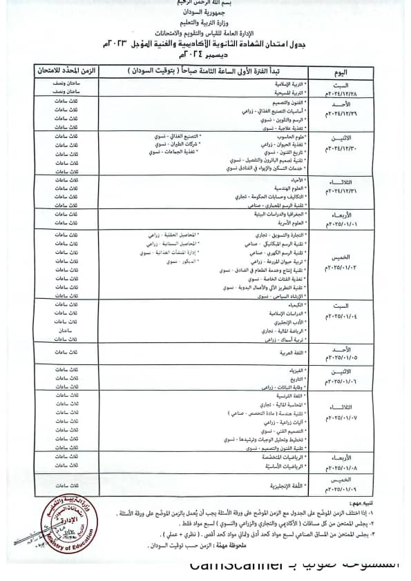 وقال أحمد الخليفة وزير التربية والتعليم المكلف، إن جدول الامتحانات صدر بمساقاتها المختلفة “أكاديمي، تجاري، صناعي، زراعي ونسوي بجانب جدول شهادة القرآن الكريم والدراسات الاسلامية وجدول شهادة التعليم الحرفي والصناعات القومية”.