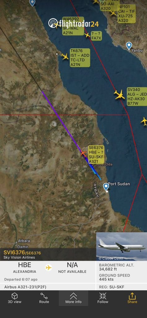 متابعات- الزاوية نت- هبطت طائرة شحن ايرباص A321 وتحمل رقم تسجيل SU-SKF والمشغل شركة سكاي فيشن المصرية، قادمة من باكو في أذربيجان بعد التوقف في الإسكندرية في مطار بورتسودان.